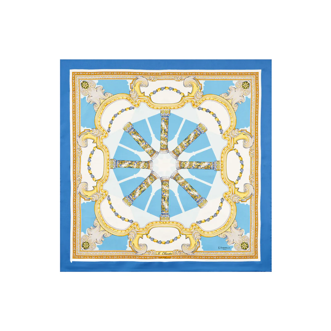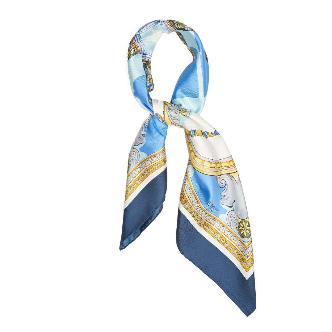 Siente la brisa y la luz de nuestras costas con este fular de seda de Lilou. Una pieza que traslada la majestuosidad de la arquitectura clásica a una paleta refrescante y luminosa, inspirada en el azul de nuestros mares.