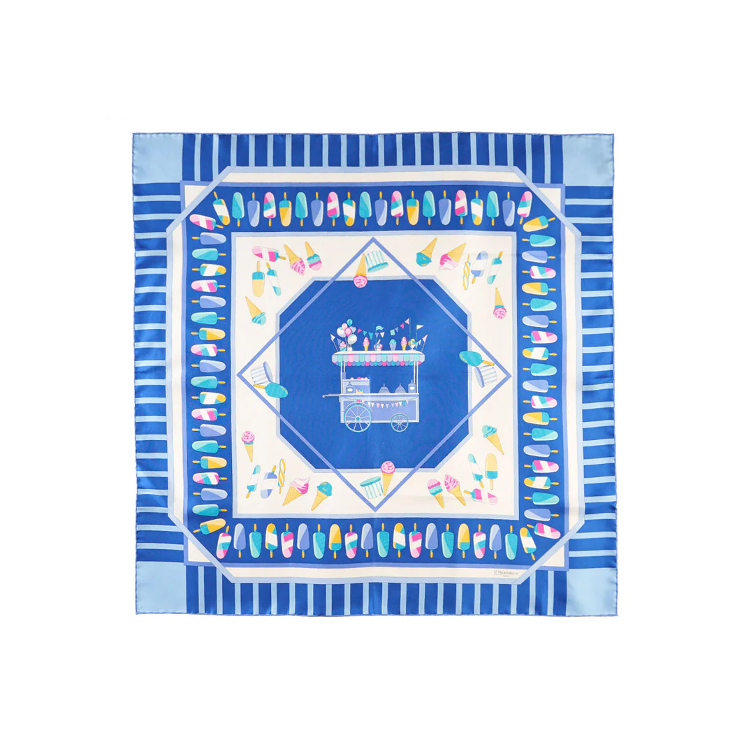 Captura la alegría del verano italiano con este divertido y elegante pañuelo de Lilou. Un diseño fresco que rinde homenaje a los clásicos carritos de helados de la costa napolitana.