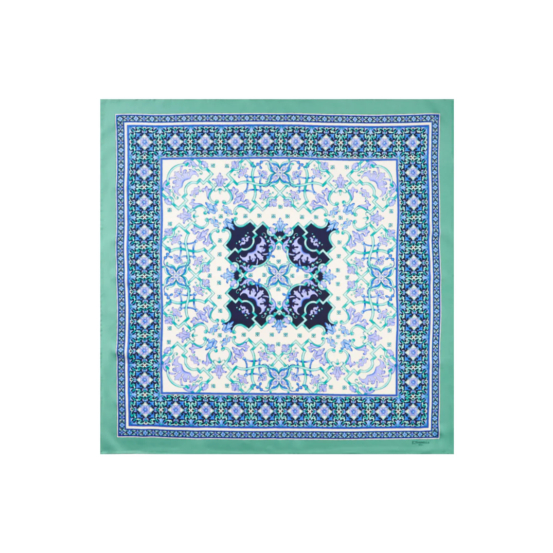 Este pañuelo de Lilou rinde tributo a la exquisita cerámica italiana con un patrón geométrico y floral que destila elegancia clásica. Una pieza atemporal que equilibra frescura y distinción.