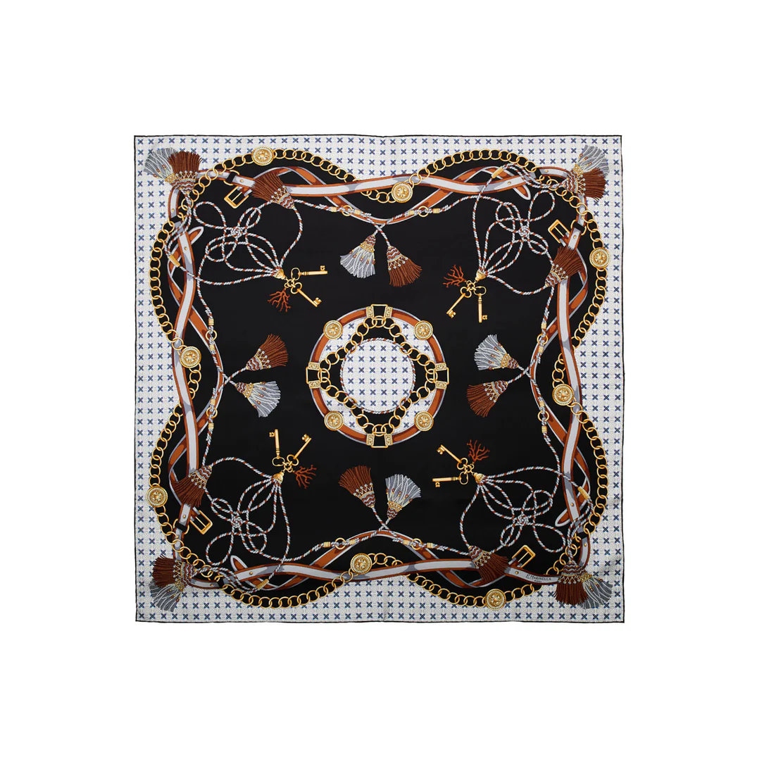 Descubre la máxima expresión de la elegancia clásica con este fular de seda de Lilou. Un diseño que rinde homenaje al mundo de la equitación y la orfebrería, fusionando elementos tradicionales en una pieza de gran fuerza visual y sofisticación.