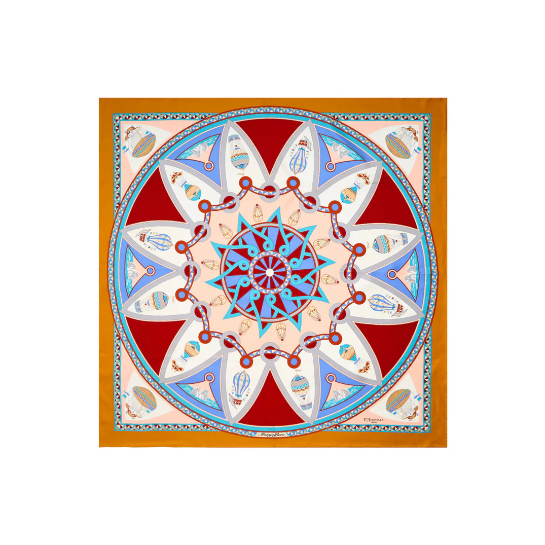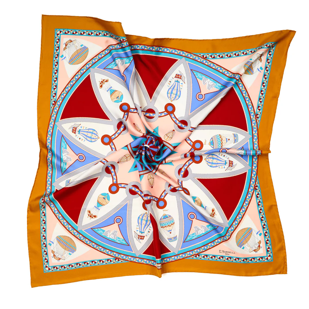 Eleva tu estilo hasta las nubes con este fular de seda de Lilou. Un diseño mágico y dinámico que celebra la era dorada de la navegación aérea y el espíritu aventurero a través de una composición artística única.